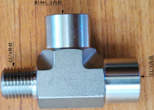 JNCS-45型采样器压力表三通,主要用于我司各类采样器加装压力表,G1/4外丝端配专用密封垫(有紫铜密封垫、316L与橡胶组合密封垫二种,用户按需订购)后,拧入钢瓶,G1/4内丝端拧入带专用密封垫(同上)的采样阀,M14×1.5内丝端(配有M14×1.5聚四氟乙烯垫圈)拧入压力表。